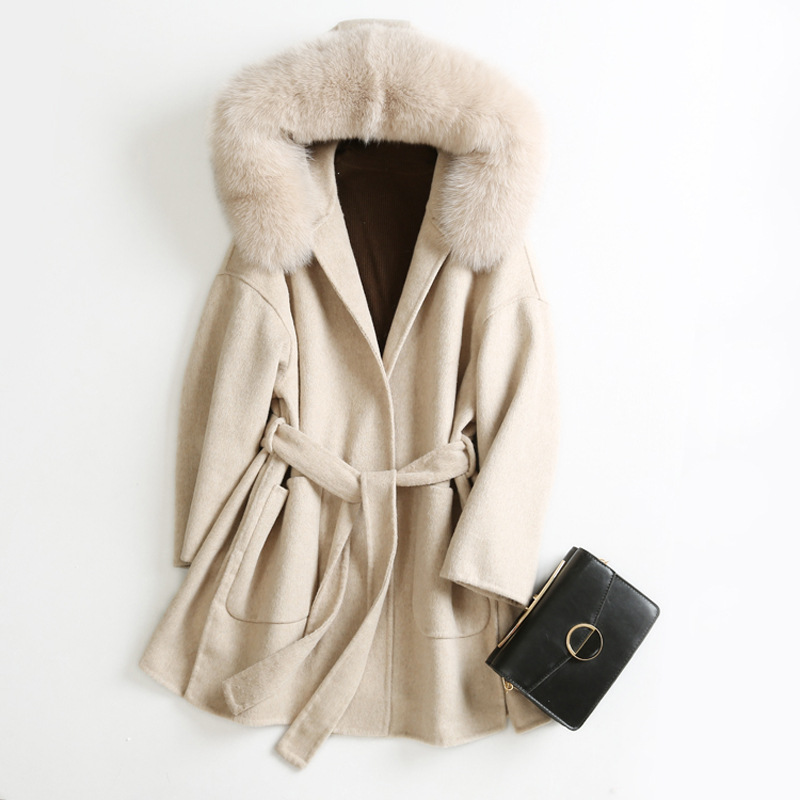 Lyxig oversize kappa i bomull med en stor och mysig luva som är gjord av äkta rävpäls, pälsen är avtagbar. Bälte i midjan. TIPS! Ånga pälsen för att få den stor och fluffig.